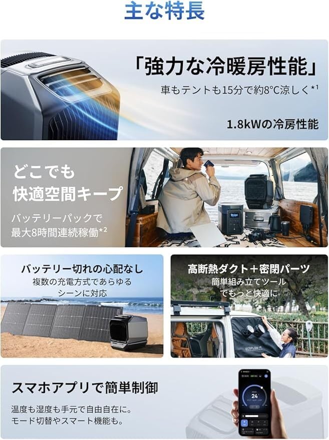 【パワーアップした冷暖房性能】従来製品から20%アップした1.8kWの冷房性能で、6畳以下の空間温度を15分程で約8°C下げる※ことができます。車やテントはもちろん、小さめのお部屋ならあっという間に涼しく快適な空間へ。また、2kWの暖房性能で、6畳以下の空間温度を15分程で約9°C上昇させる※ことも。春先や秋口の肌寒い季節に、快適なアウトドア体験を提供します。 ※外気温を25°C(冷房) / 16°C(暖房)と想定した場合の概算データです。使用環境などに応じて変動する可能性があります。